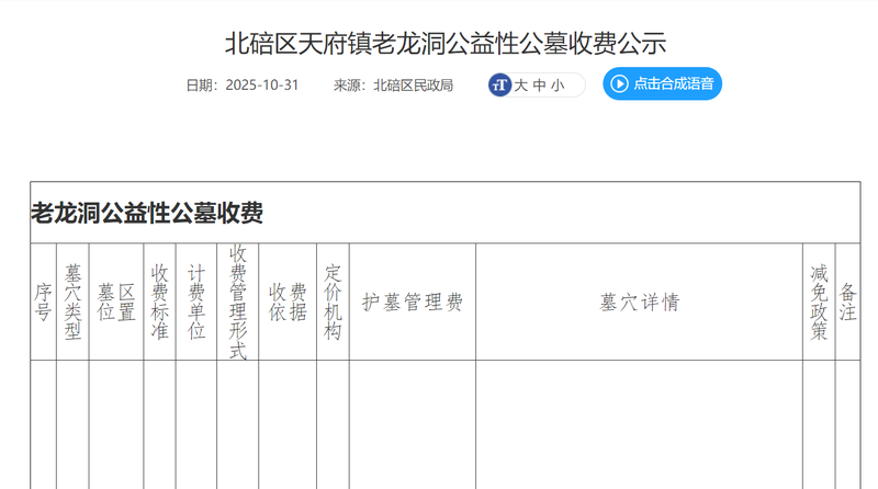 北碚区天府镇老龙洞公益性公墓收费公示
